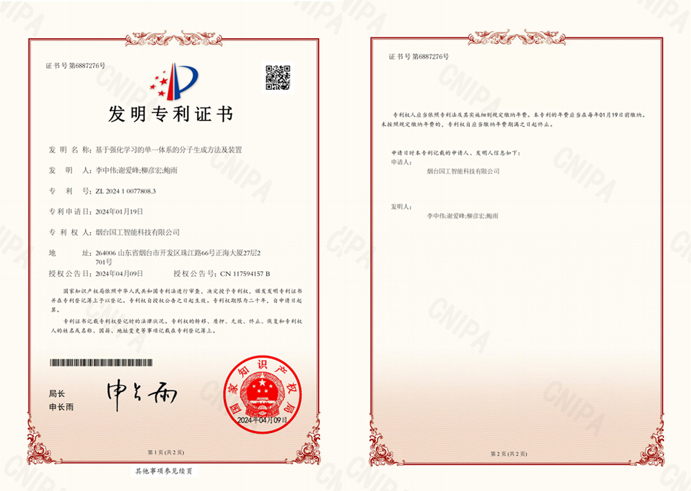 近日,國(guó)工智能新添國(guó)家知識(shí)產(chǎn)權(quán)局頒發(fā)的一項(xiàng)發(fā)明專(zhuān)利證書(shū)“基于強(qiáng)化學(xué)習(xí)的單一體系的分子生成方法及裝置”。