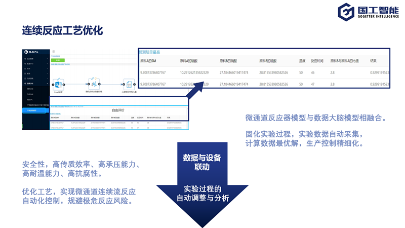 根據生產和質量數據人工智能系統會直接計算最優的收益率,最優原材料配比,最優的反應時間、溫度并給出最優工藝參數建議同時系統可以反向控制相關反應設備,形成優化閉環。