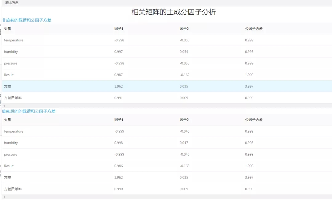 使用集成好算法的因子分析組件進(jìn)行數(shù)據(jù)的因子分析處理,對(duì)組件參數(shù)進(jìn)行設(shè)置,變量字段配置為溫度、濕度、壓強(qiáng)、實(shí)驗(yàn)結(jié)果,因?yàn)楣灿?/span>4個(gè)變量,所以要提取的因子數(shù)配置為2,單擊運(yùn)行,從調(diào)試面板中查看分析結(jié)果。