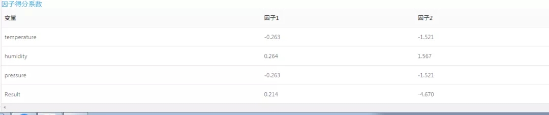 濕度(0.998)和結(jié)果值(0.986)在因子1上具有較大的正載荷,溫度(0.999)、濕度(0.998)、壓強(qiáng)(0.999)和結(jié)果值(1)在因子3上具有較大的正載荷,所以這兩個(gè)因子共同解釋數(shù)據(jù)變異的0.999或99.9%。