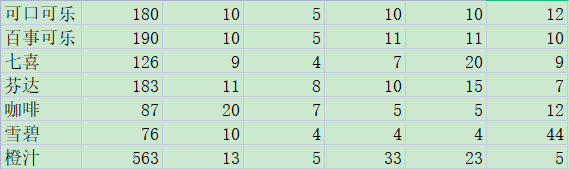 現有7種飲品,可口可樂,百事可樂,七喜,芬達,咖啡,雪碧,橙汁。測試人員對其營養成分進行觀測值聚類分析。