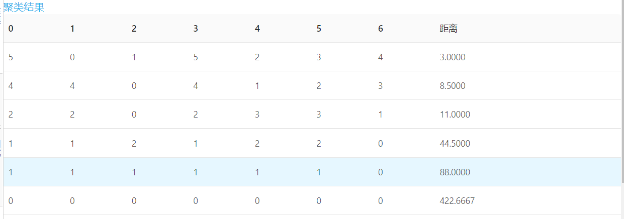 通過國工數據大腦分析平臺分析的聚類結果可以看出,如果想看聚2類找倒數第二行,0到5都是1分為一類,6為0作為另一類。如果想看聚3類找倒數第三行,0、1、3都是1,分為一類,2、4、5都是2作為第二類,6為0作為第三類。依次類推。