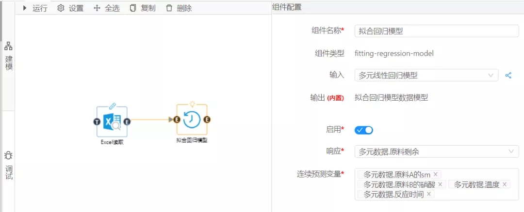 首先,利用數(shù)據(jù)大腦中的多元線性回歸組件,就可得到回歸系數(shù):a1,a2,a3,a4的值。即把多元線性回歸組件拖到到工作面板,配置數(shù)據(jù)及組件參數(shù):將因變量和4個自變量分別拖到對應(yīng)的區(qū)域。過程如圖1: