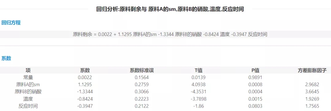 成本高低不僅影響著化工行業(yè)企業(yè)的利潤,更是其公司發(fā)展壯大的一個制約因素。某有機新材料企業(yè)想要減少化學(xué)反應(yīng)中的原料剩余并預(yù)測在某種反應(yīng)參數(shù)變量取值下的原料剩余。原料剩余越少,成本利用率越高。把我們想要研究的對象原料剩余(Y)作為因變量,選取了4個主要影響因素:原料A的SM(X1);原料B的硝酸(X2);溫度(X3);反應(yīng)時間(X4)。并進行22次試驗。基于22次實驗數(shù)據(jù)進行多元線性回歸。