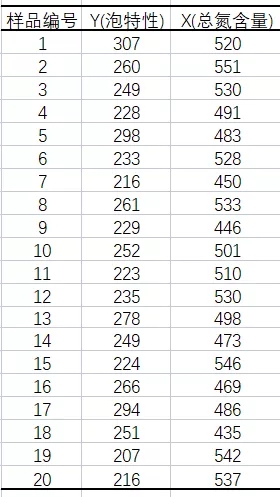 化工、釀造等裝置性行業的過程控制,往往是多變量共同作用。為了做好過程控制,實現“以因素管理結果",我們運用回歸分析的統計技術尋找規律,并用于生產過程控制。例如,啤酒釀造過程中成品啤酒的泡特性(秒),是直接關系到啤酒口感的技術要求。技術和經驗表明中間產物的總氮含量X對于需要滿足的泡沫時間Y (秒)有影響。數據如下: