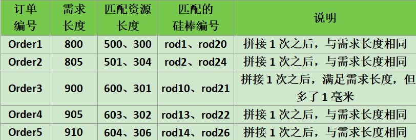 舉個(gè)例子,有50 個(gè)需求,倉庫中有1000個(gè)原料,要在材質(zhì),規(guī)格,長度需求上滿足需求,可拼接,但是每個(gè)硅棒需求最多允許拼接2次,可以超長,但是超長的部分不可超過50mm,超長的部分越少越好。