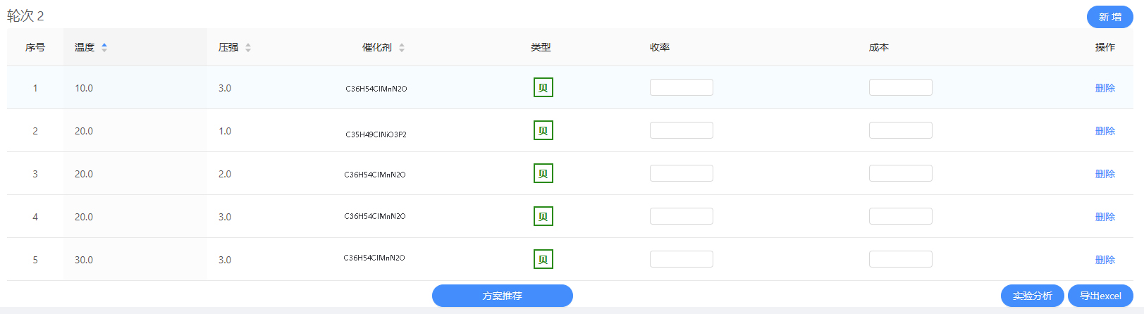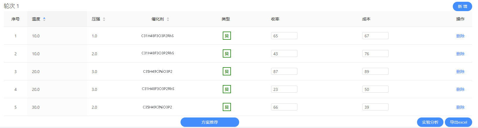 其次,實驗信息配置完成后,即可開始進行算法優(yōu)化。在首輪沒有歷史數(shù)據(jù)的情況下,需要隨機從搜索空間中生成用戶指定個數(shù)的初始樣本,這里以5個為例,如圖3為輪次1的信息,這里的收率及成本實際值需要做實驗進行回填,用戶也可以根據(jù)自己的需求刪除一些樣本。