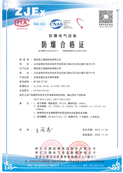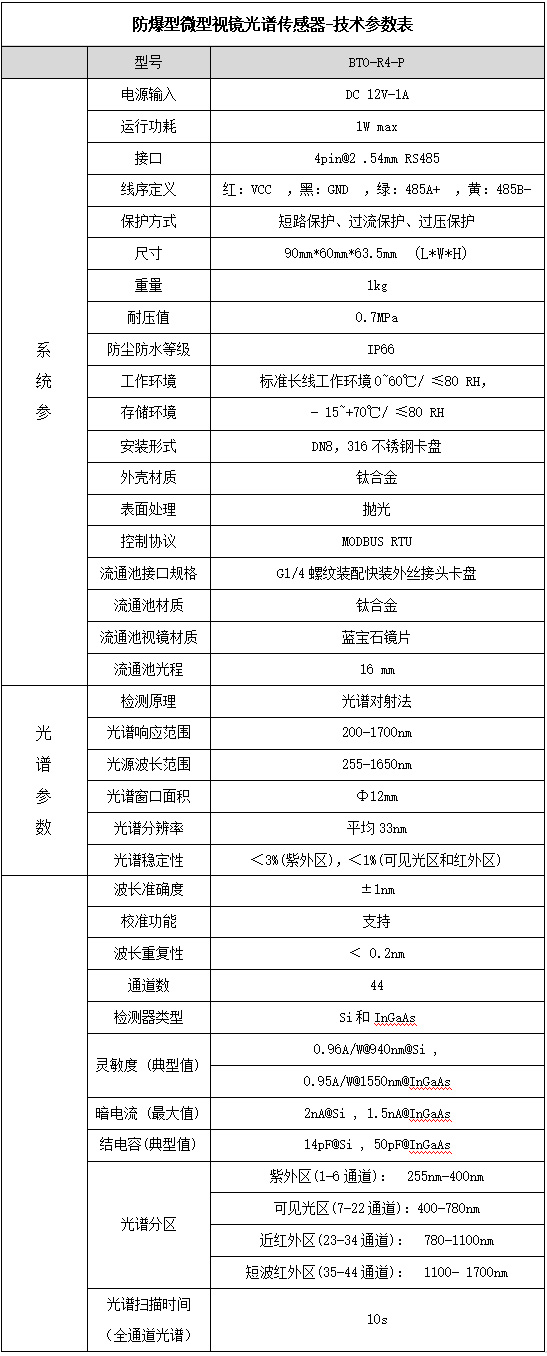 根據(jù)客戶現(xiàn)場情況,我們采用的是防爆型視鏡光譜傳感器。防爆型微型視鏡光譜傳感器對于傳統(tǒng)的視鏡、光譜傳感器分離的產(chǎn)品,該傳感器具有安裝更加方便,受環(huán)境干擾更小,使用安全性更高特點,并且不受游離堿和溫度等因素的影響,在檢測有效氯濃度的同時也能檢測游離堿濃度,更有利于實時準確判斷反應(yīng)進度和反應(yīng)終結(jié)點。