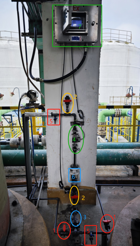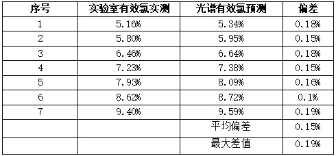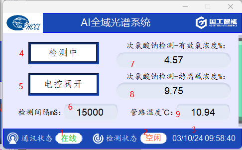 圖中圈1的地方為手動閥,當打開其中一個手動閥,物料即流經(jīng)管道,接著打開電磁閥(圈2)物料先經(jīng)過Y型過濾器(圈3),再經(jīng)過視盅(圈6),然后充滿光譜儀(圈4)一直流經(jīng)至取樣口(圈5),打開取樣口進行取樣送檢,同時光譜儀開始檢測,當實驗室檢測結(jié)果出來后,我們將同批次光譜檢測的物料有效氯的含量參數(shù)和游離堿的含量參數(shù)進行標定,以此類推,進行大量取樣檢測標定過程。檢測結(jié)果在光譜控制柜(圈7)上直接顯示。