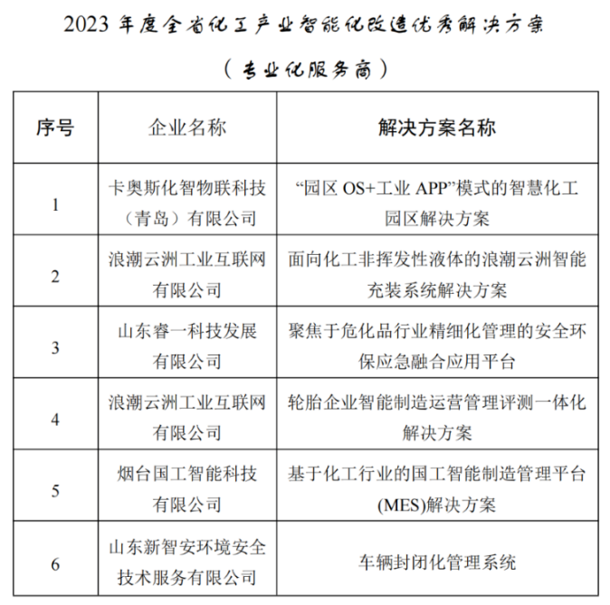 根據《關于組織開展2023年度化工產業智能化改造優秀解決方案遴選工作的通知》(魯化安轉辦〔2023〕28號)要求,省化工專項行動辦組織開展了2023年全省化工產業智能化改造優秀解決方案遴選工作。經自愿申報、各市推薦、專家評審等程序,擬確定2023年全省化工產業智能化改造優秀解決方案服務商,現予以公示。國工智能榮幸的被評選為2023 年度全省化工產業智能化改造優秀解決方案專業服務商。