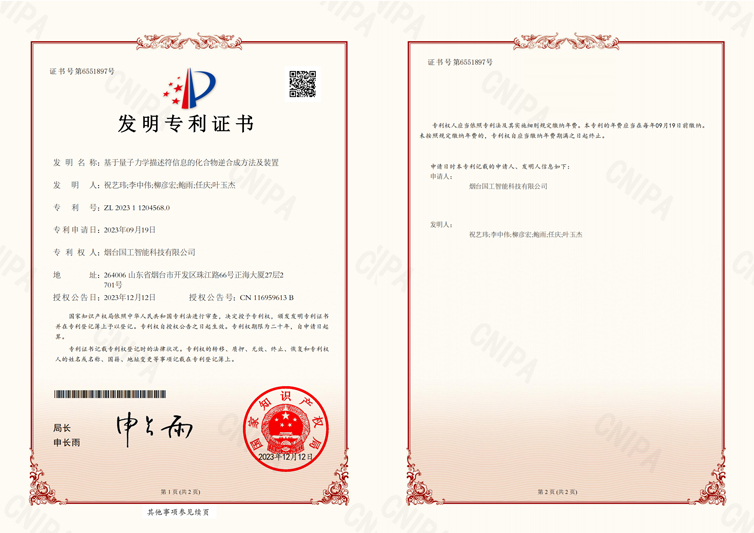 近日,國工智能新添國家知識產權局頒發的一項發明專利證書“基于量子力學描述符信息的化合物逆合成方法及裝置”。