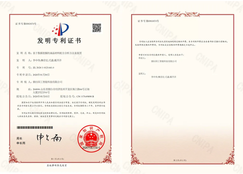 近日,國工智能新添國家知識產(chǎn)權(quán)局頒發(fā)的一項發(fā)明專利證書“基于數(shù)據(jù)挖掘的液晶材料配方分析方法及裝置”。