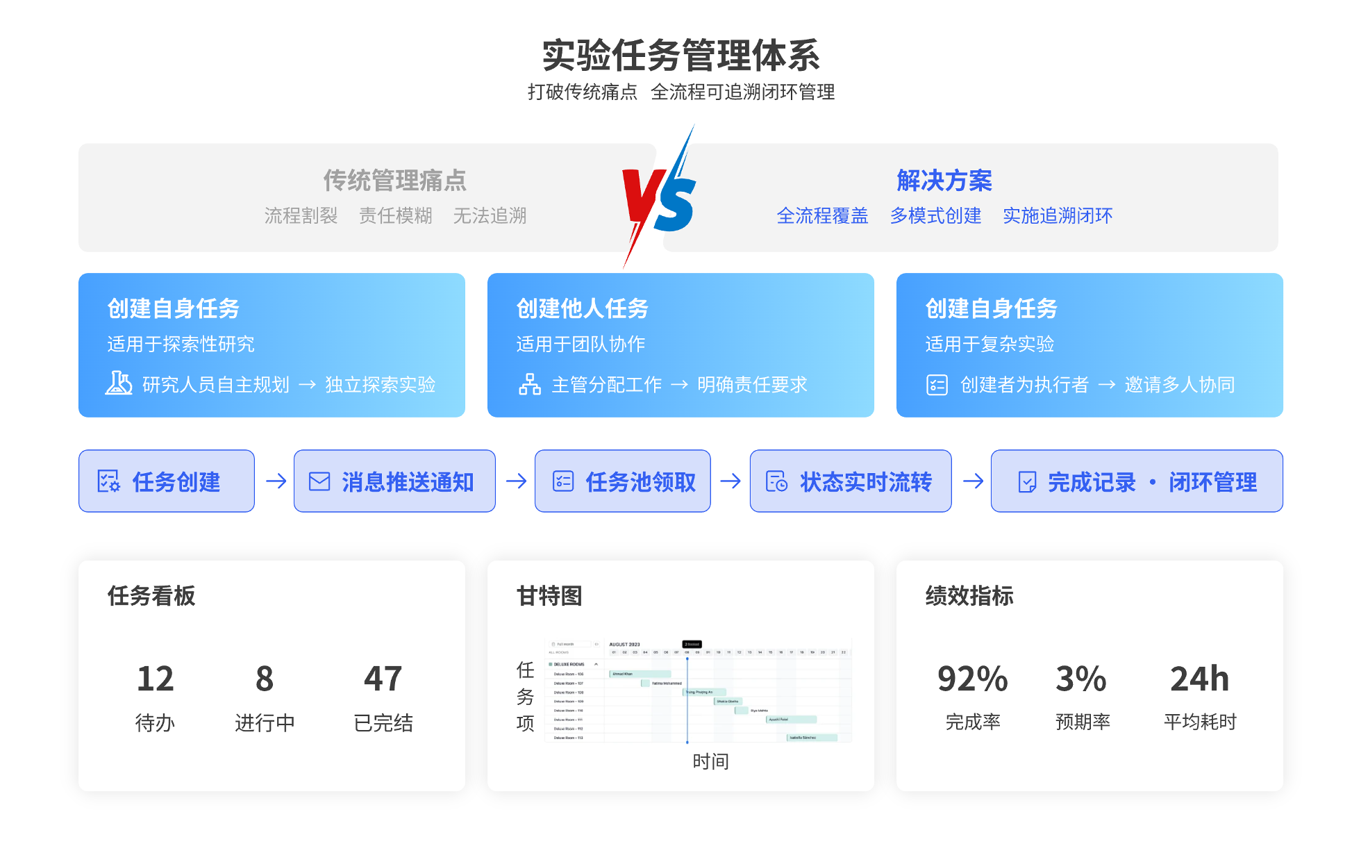 實驗任務自動化分配、儀器參數(shù)遠程下發(fā)、數(shù)據(jù)自動采集,消除重復性人工操作,研發(fā)周期縮短30%-50%。支持多設備并行執(zhí)行與7×24小時無人值守,實驗通量暴漲200%-300%,產能瓶頸有效突破。知識資產數(shù)字化沉淀