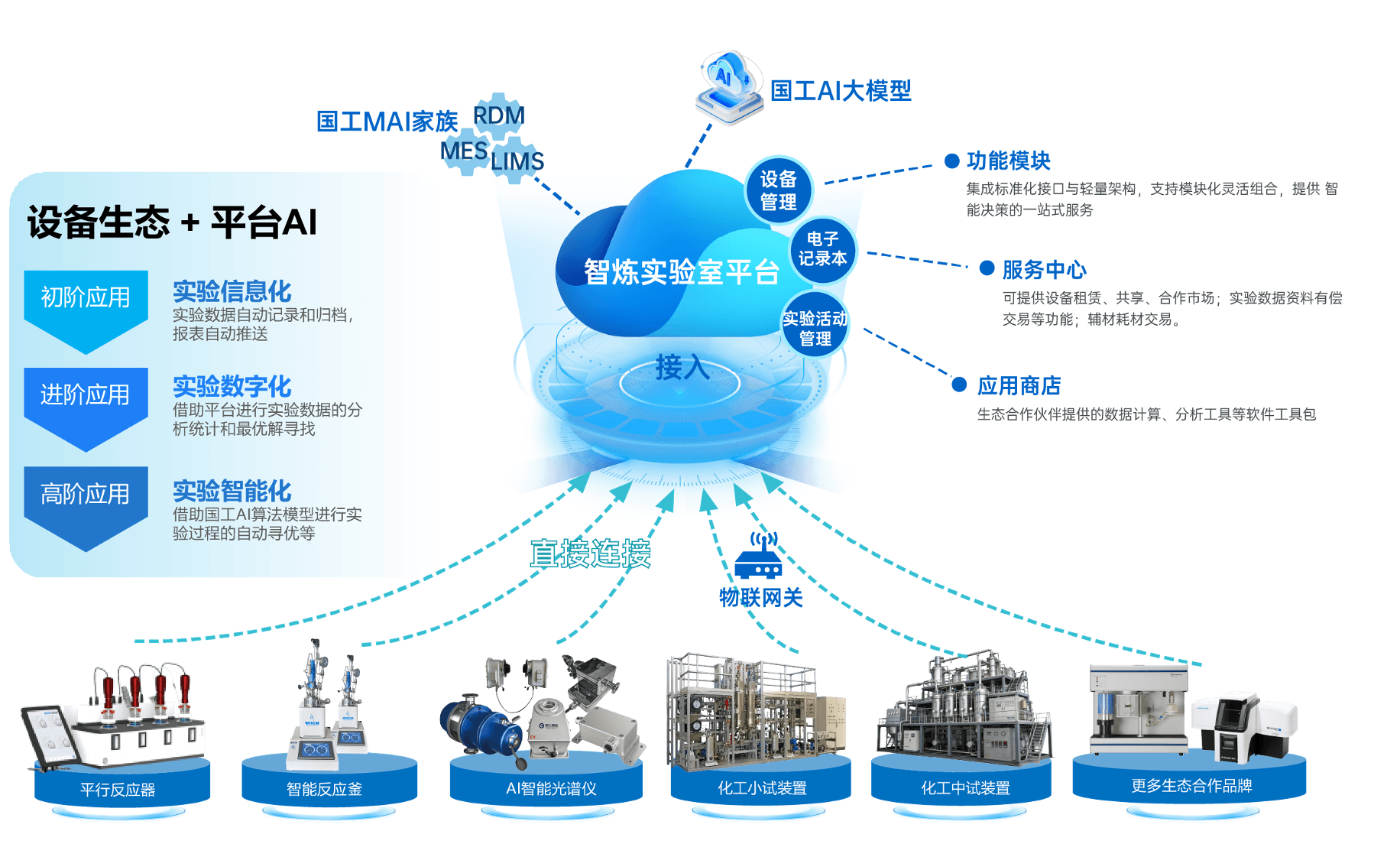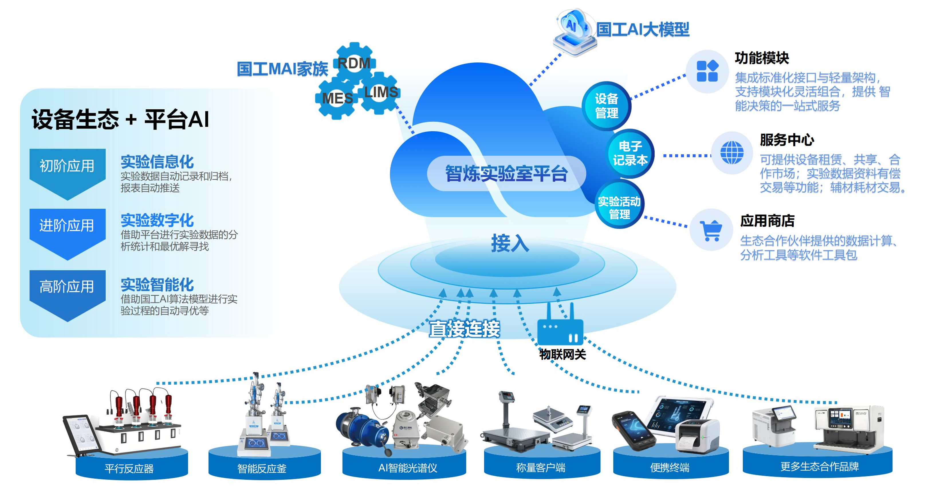 以智煉實驗室平臺為核心的化工研發(fā)一體化系統(tǒng)智煉實驗室平臺以 “設備生態(tài) + 平臺 AI” 為核心,通過工業(yè)物聯(lián)能力快速對接智能反應釜、AI智能光譜儀等實驗設備,打通設備與設備、設備與信息系統(tǒng)之間的數(shù)據(jù)通道,構建集設備管理、電子記錄本、實驗活動管理于一體的智能實驗研發(fā)中樞。產品可聯(lián)動國工 MAI 家族與 AI 云計算平臺,也提供開放化快速接口可快速對接用戶方其它類型的信息系統(tǒng);提供功能模塊、服務中心與應用商店,支撐實驗信息化、數(shù)字化、智能化進階應用,助力科研向數(shù)據(jù)驅動 + AI 賦能轉型。